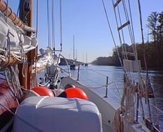 Iwalani was not built for these conditions, but seems to be adapting well. Her seven-foot draft has limited the places we can visit, but knock on wood, we haven't touched bottom yet. (Whoops!! I guess I didn't knock loud enough, more to come later.) Phil is down below with the TV going, baking bread- the total picture of domesticity. It is finally warm enough that the winter hats and gloves have all come off. They are washed and are now hanging by clothespins along the lifelines waiting to be, hopefully, placed in bags for long-term storage; maybe to re-appear somewhere near Tasmania or New Zealand, if we make it that far. At the beginning of the week we continued sailing down the Chesapeake, with moderate NW winds. It was still cold, but nowhere near like the conditions everyone in the Gulf of Maine was experiencing. The Chesapeake seems like such a fragile environment. It is a huge estuary- or fish nursery, supplying ninety percent of the striped bass that eventually make it to Maine waters. Ninety percent. That is an awful lot. Fortunately, it seems that the Marine resources Depts. are trying their best to enact and enforce legislation to protect this fragile environment. I have been reading the book "Beautiful Swimmers" by, William Warner, which Phil has been plugging for years; about the life cycle of the blue claw crab-, it actually is a very good book and did win a Pulitzer Prize. I was surprised that the Chesapeake wasn't more rural. We missed quite a bit of the eastern shore- since the average depth on that side is no more than five feet, where I am told that time has reversed itself by twenty years... I can only hope Mac Mansions which seem to be the bane of suburban civilization, haven't found their way over there. So many huge cities- Baltimore, Annapolis, Washington DC, Philadelphia, Norfolk, to name a few- all built on rivers, eventually drain into the Chesapeake. It is amazing that the Chesapeake has survived at all. We in Maine would be wise to keep an eye on the conservation policies to our South, since they do have an impact on our own fisheries. On the TV they are addressing the problems created by the huge tankers that cruise up the Chesapeake and Delaware rivers from far away ports. These huge ships use water collected from their starting ports as ballast, which they discharge as soon as they get inside protected waters. The water ballast contains bacteria and viruses, which are already, killing off the oyster bed substrate. Who knows what other diseases and organisms are being discharged? We sighted our first pelican, about twenty miles north of Norfolk. Norfolk itself had much less shipping traffic than I had pictured in my imagination. It was still a little nerve wracking, since we arrived on the edge of darkness. We anchored in an area called Hampton flats and the following morning used our cell phone to decide which intracoastal route to take- The Dismal Swamp, or the Norfolk cut. Unfortunately, the army corps of engineers said that a boat with 6 1/2-foot draft made it through, but another seven footer had to turn back. Once again the more picturesque route had to be avoided because we are constrained by our draft. Already, we are thinking about "the next boat" She will be a steel barge, perhaps a sailing barge, with tabernacle mast and leeboards- but shoal draft- drawing two feet, no more. When we are old and feeble, this mechanized behemoth will allow us to explore the inland waterways, rivers and canals... (poor Phil, he will never get any rest.) Motoring through Norfolk, we passed many Navy ships tied to their slips. We didn't recognize any bath-built Aegis destroyers. The "Cole" arrived a few days later. "A ship on a ship" which blew Phil away. It completely befuddled his definition of a ship- "you can ship a boat on a ship, but you can't ship a ship on a ship" We saw pictures of the Aegis destroyer hole up, on a ship, on the television, but didn't get to see it in person. Norfolk's waterfront appears to be totally revitalized. It looks like an interesting place to hang around, rather than rush right through like we did. Perhaps another time. We motored on, our fishing lines still following-practically the whole way from Maine-and I still haven't caught a single fish. I lost my crab trap in the Potomac-, which was almost as bad as leaving my heart in San Francisco. I was VERY depressed afterward- even though I have never caught a crab. I know I shouldn't complain, we have plenty of canned food on board, but I am totally sick of pork, which is the easiest meat to deal with on a boat. Canned hams, pepperoni, bacon and the packaged marinated pork roasts in plastic bags all can last for weeks in the average boat. Chicken, beef, lamb and fish don't come in as many storable forms. Maybe when we get to the gulf stream again, I will go through the same aversion to meat, but right now Phil and I dream about fresh fish sushi, or drippy juicy burgers... we finally met up with the latter, in a place called "Hodads" on Halloween night. After passing through the "Great Bridge Lock", Iwalani's first lock-good practice for us, but kind of a joke, as we couldn't tell if we had gone up or down, (with the drought there was no change in water level and it hardly warranted a lock). We tied up to trees lining the canal side; faintly reminiscent of barging in the English canals. We put a candle in the ceramic pumpkin, courtesy of my sister-in-law Leo, placed the lit pumpkin on the "escargot" to ward off evil Halloween spirits and headed off in search of red meat- the modern day version of American buffalo hunters. Following our noses, we managed to track down several pina coladas, complete with a dollop of fluffy whipped cream, (like there wasn't enough calories already in the glass), and loaded dripping, juicy burgers (including crab meat); so much saturated fat, that my chilomicrons and pancreas were hollering for relief. Totally delicious! Following this meal, we didn't eat ag