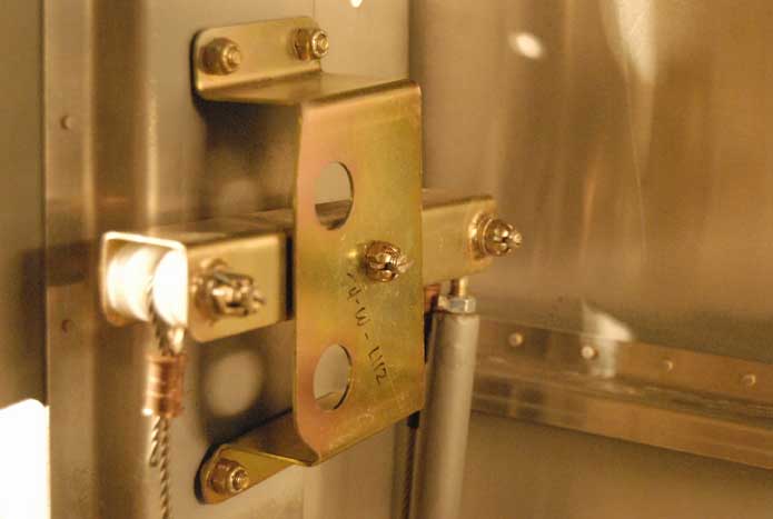 | Spacers on bellcrank bracket to allow clearance on cable attachment bolt. | ||